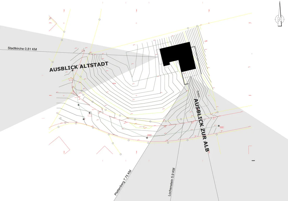 Bezugsplan, Entwurf des Gebäudes in direkter Beziehung zu Ort, Topografie und Lage- Wohnhaus © Otto M. F. Beutter