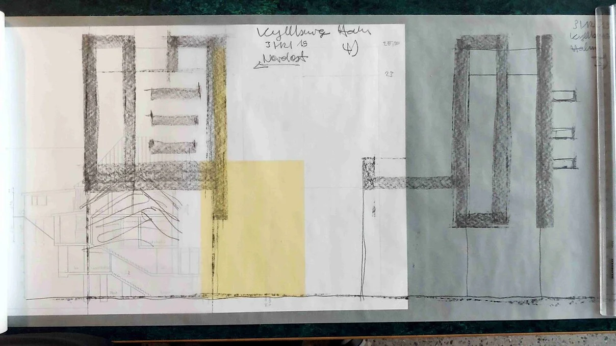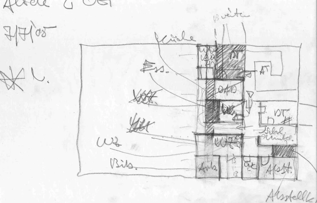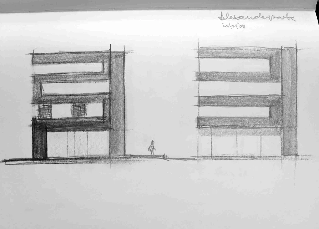 Entwurfsskizze Fassadengestaltung 5- geschssiges Wohngebäude, organisiert als 2- Spänner © Otto M. F. Beutter