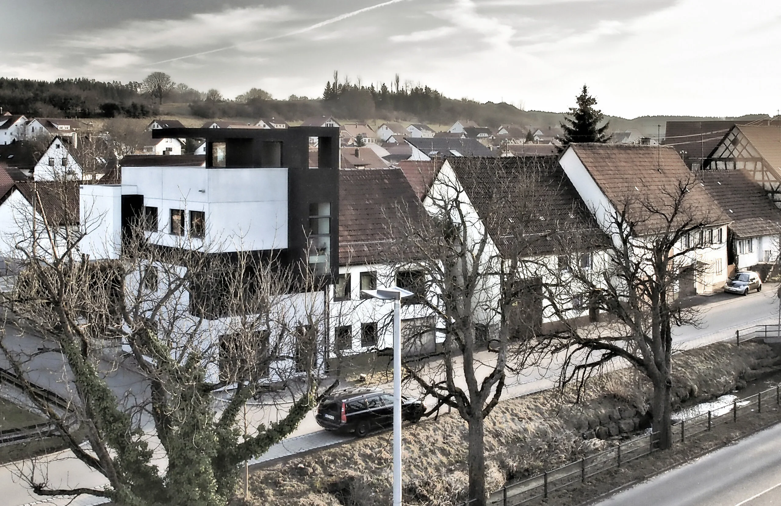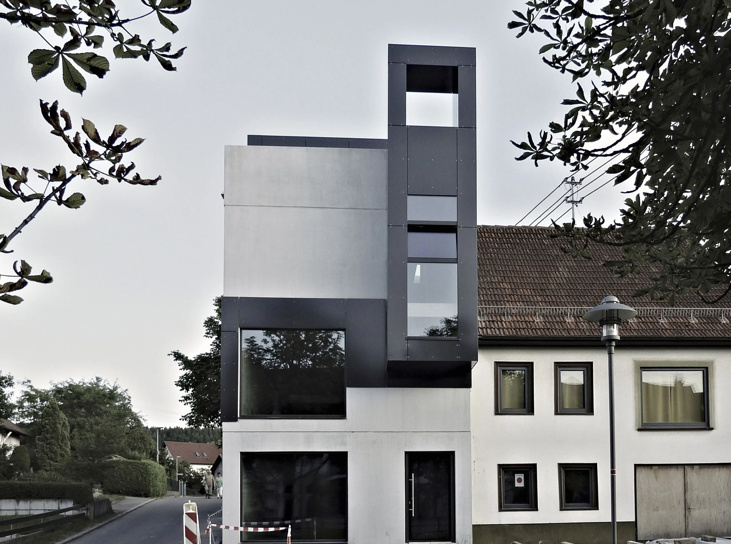 Vertikales Gebäudeelement nach Norden als Manifestation an der Hauptfassade und Zeichensetzung gegenüber der aneinandergefügten und entlang der Straße gerichteten, großvolumigen Satteldachbebauung des Altbestandes; Zeichen des erhobenen Armes; ... „hier kommt das Neue“