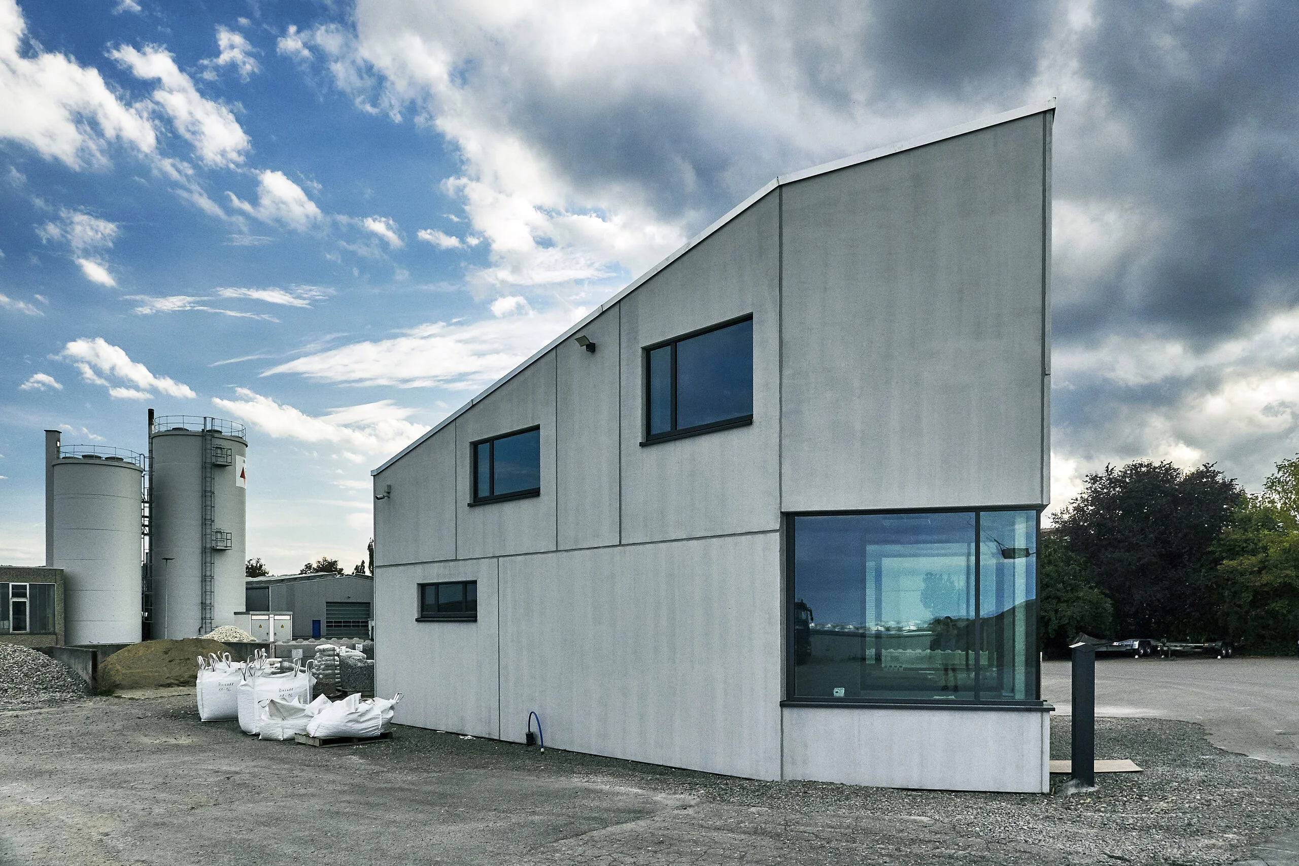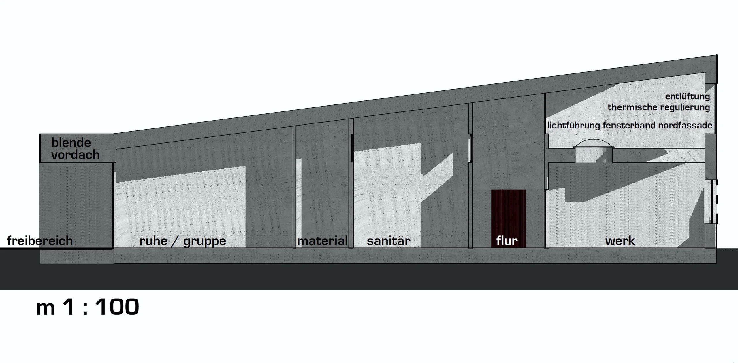 Die Gesamterscheinung des Entwurfes in seiner monolithischen Form mit dem Pultdach und der Verdrehung des Arbeitsplatzbereiches um 33° erinnert an einen aus dem Fels gebrochenen Stein und passt somit auch gut zur Firmen- philosophie der Bauherren. Hierbei dient Architektur nicht nur als Arbeits- und Werkstätte, sondern wird zum Markenzeichen, das sowohl vor Ort als auch im Rahmen interner und externer Kommunikation Aufmerksamkeit schafft und Umsatz generiert.