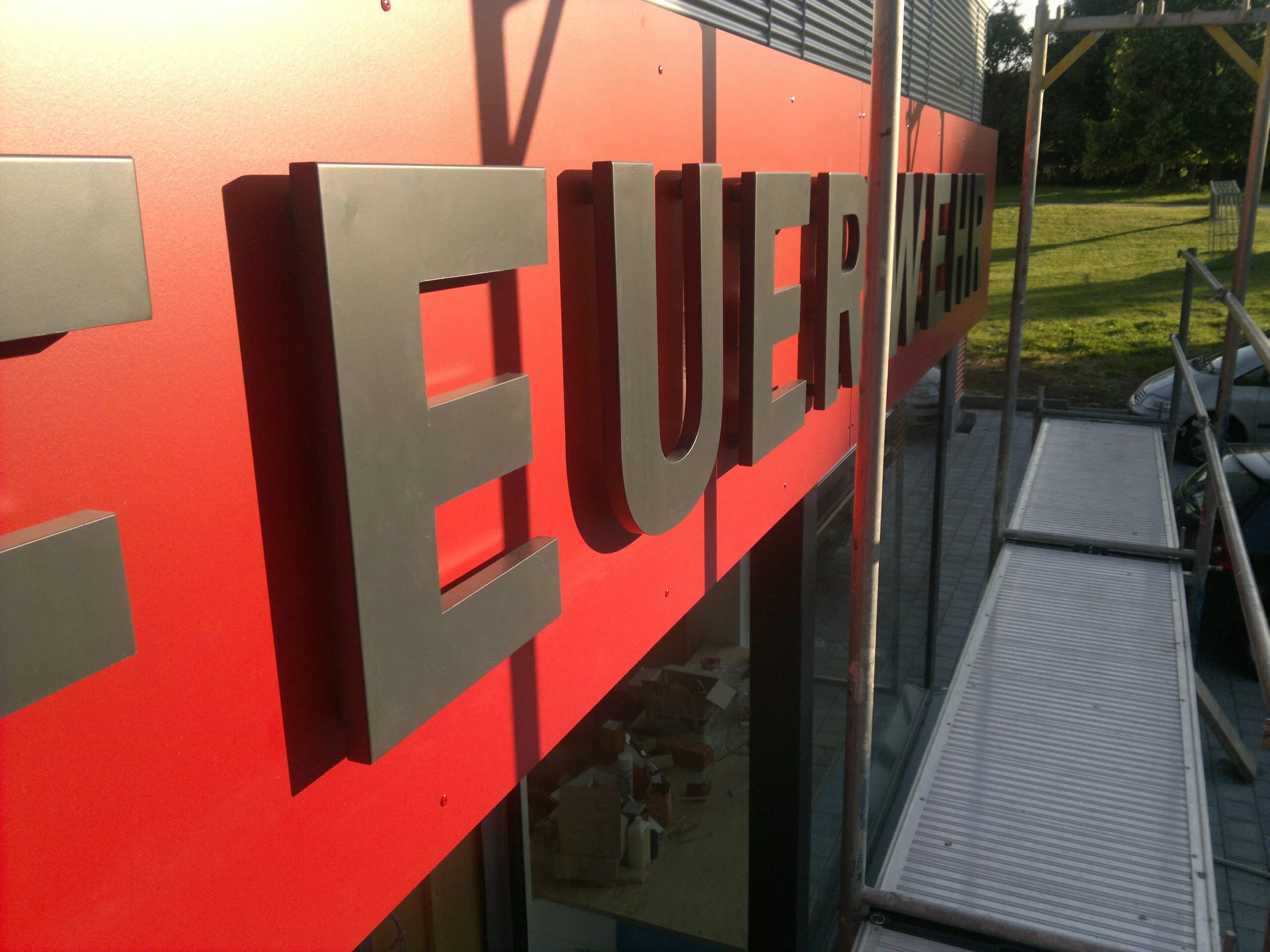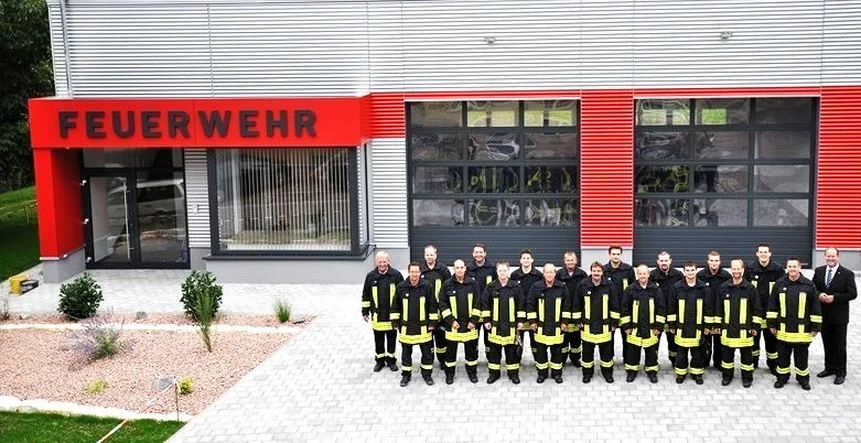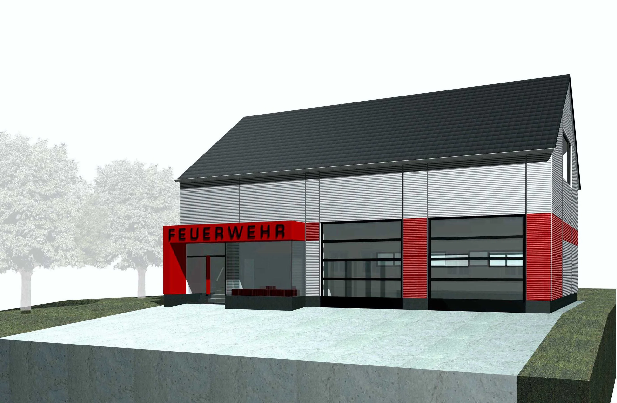 Funktionales Feuerwehrgerätehaus mit zwei Fahrzeugboxen, verglastem Kommandostand, Mannschaftsraum für 30 Personen und Schulungsraum im Obergeschoss.
