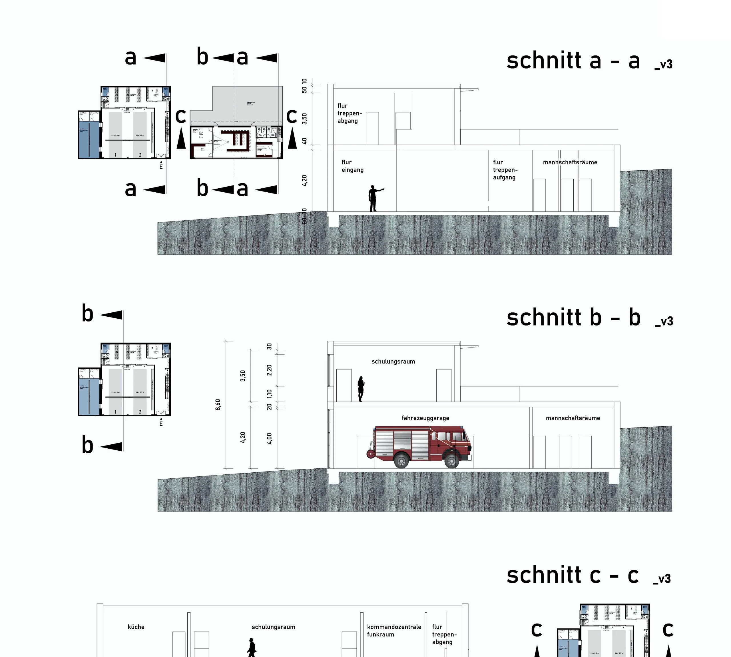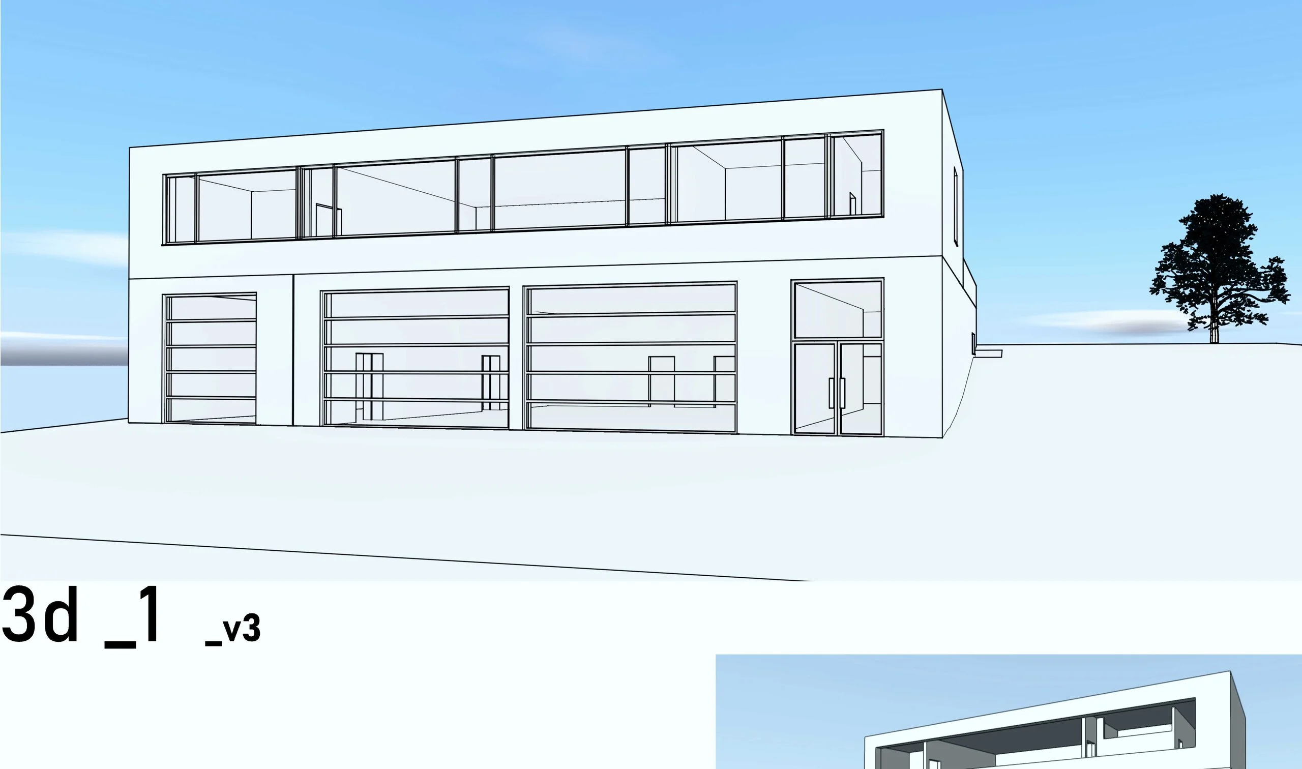 Funktionale Feuerwache mit zwei Fahrzeughallen und Waschbox, für drei große Einsatzfahrzeuge mit einer Länge von bis zu 10m.