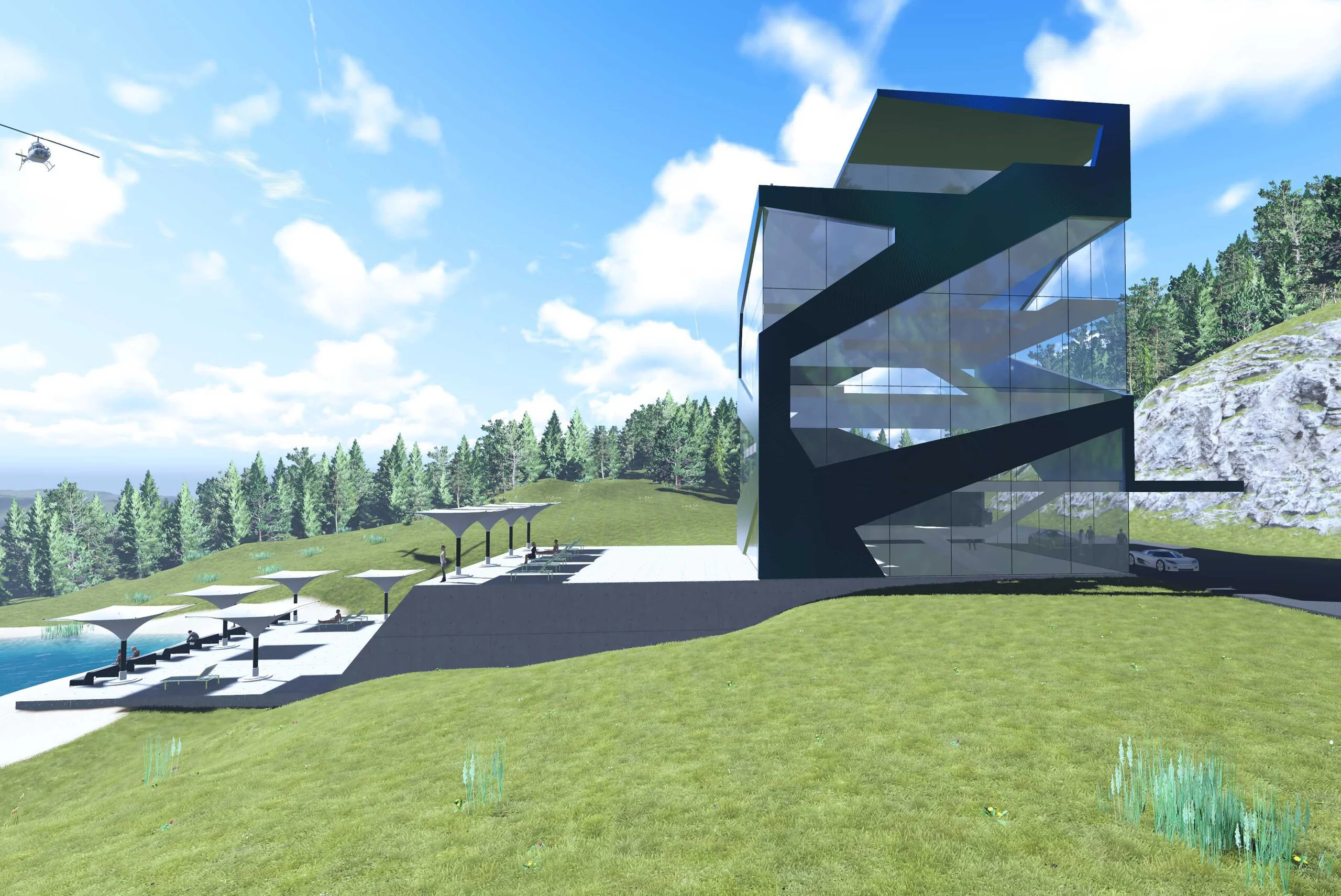 Große expressive Formen umgeben den auf drei Ebenen organisierten Bau.