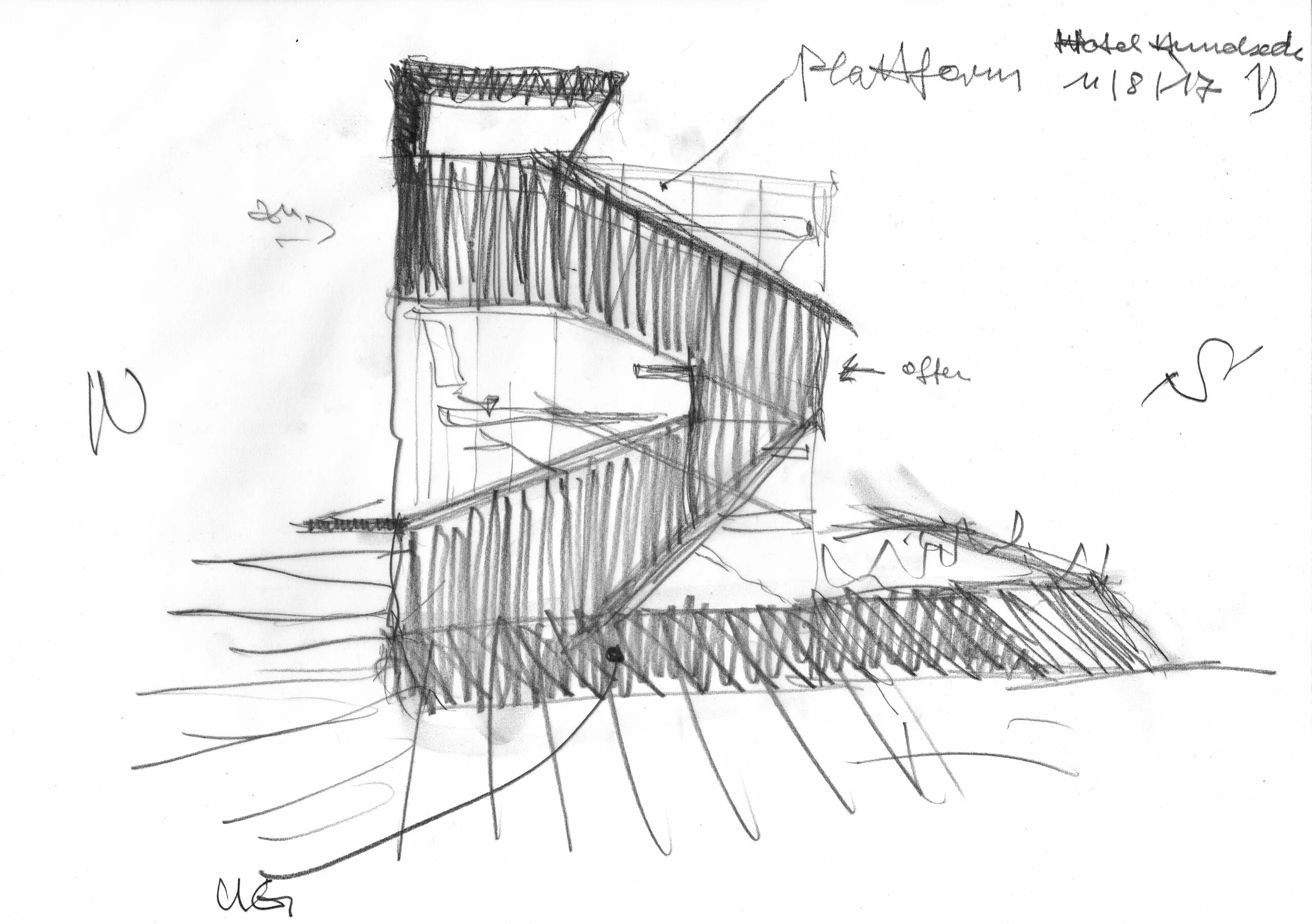 Zu Beginn der Planung und der Konzeptentwicklung war der Entwurfsgedanke ein Gebäude entstehen zu lassen, welches aus denselben Zutaten, wie die Materialien aus seinem direkten Umfeld besteht.