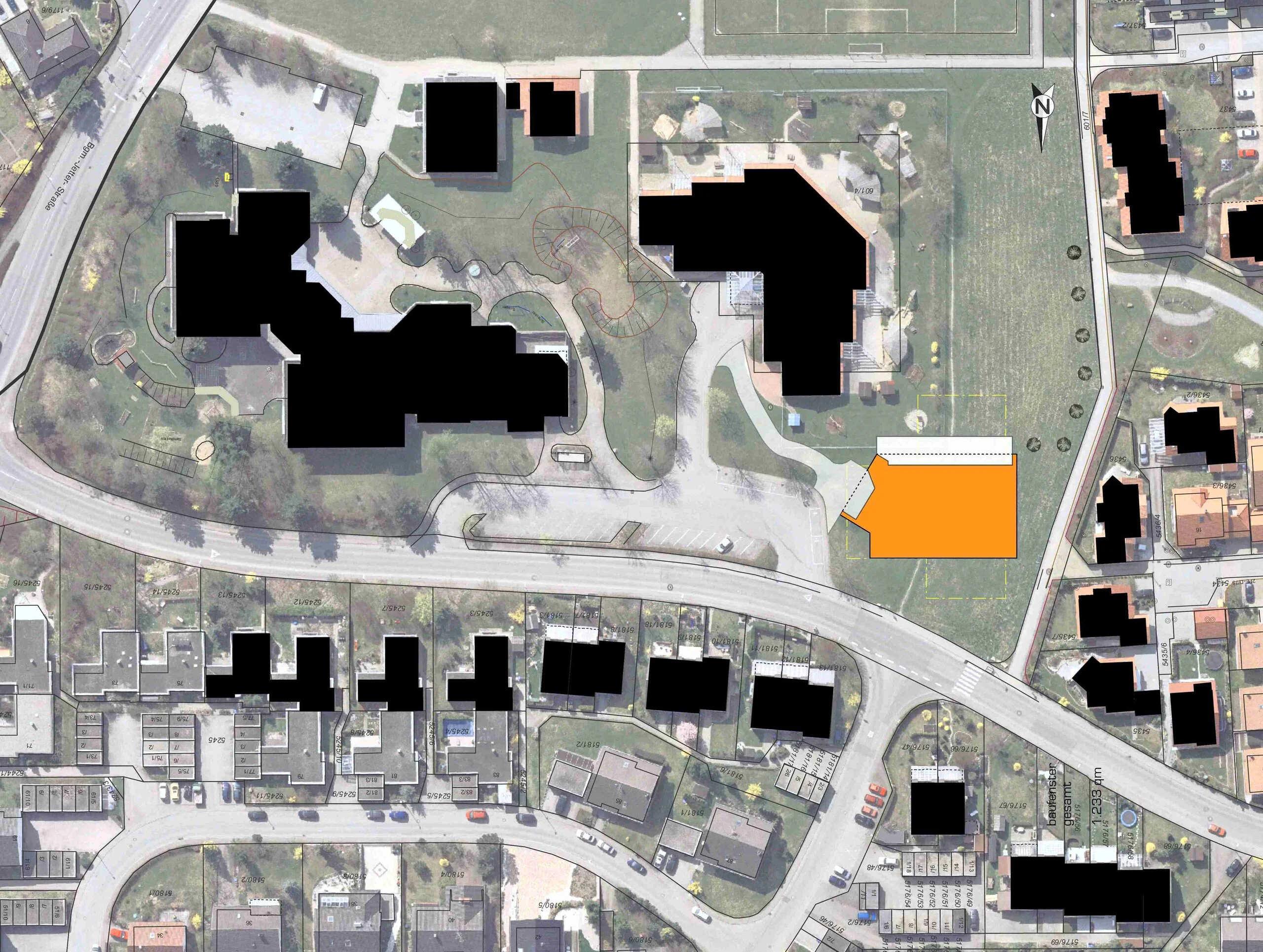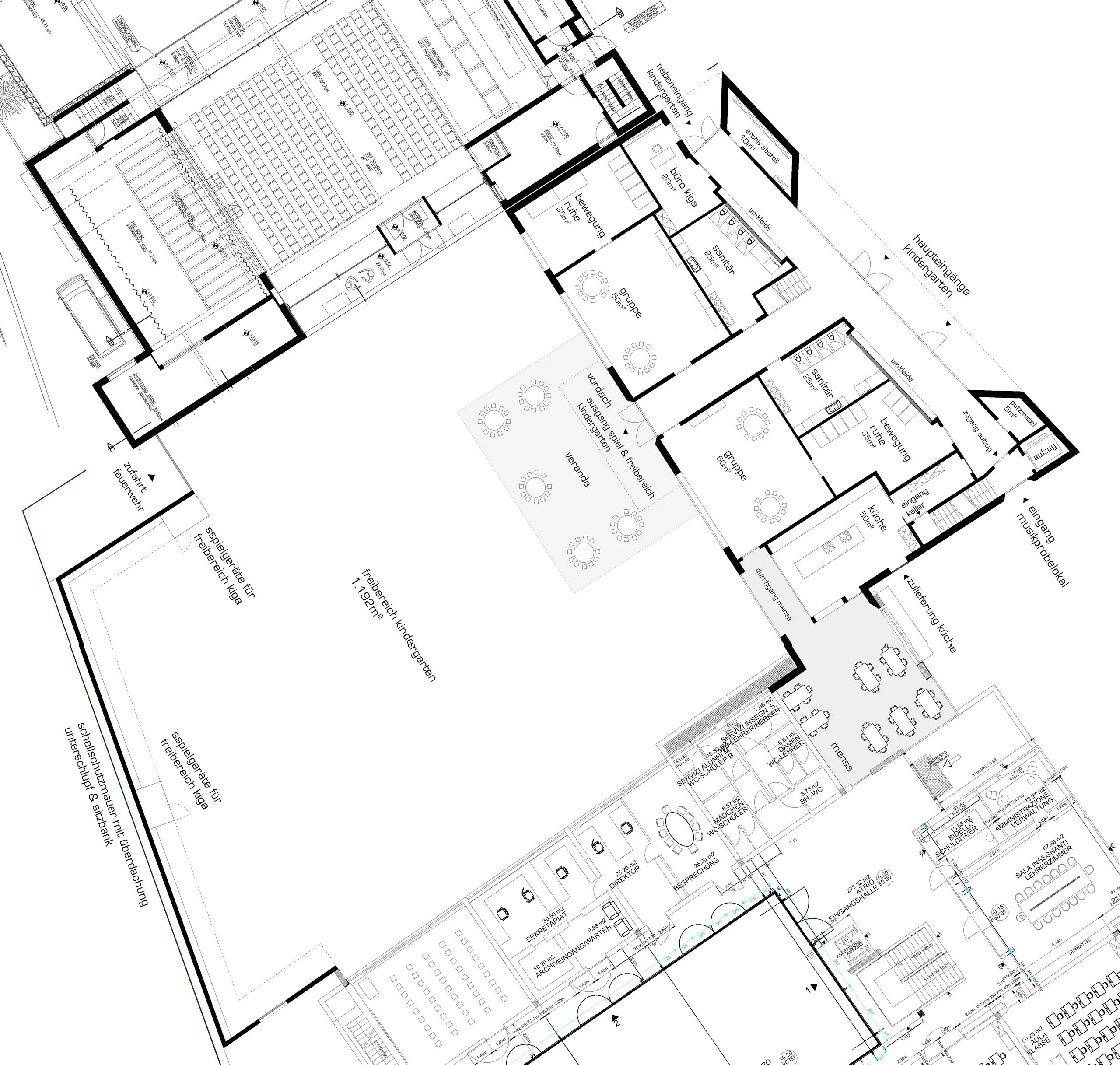Kindergarten für 6 Gruppen mit Turnraum, Werkraum, Therapieraum, Küche, Personalbereich und großzügigem Foyer.