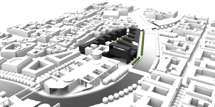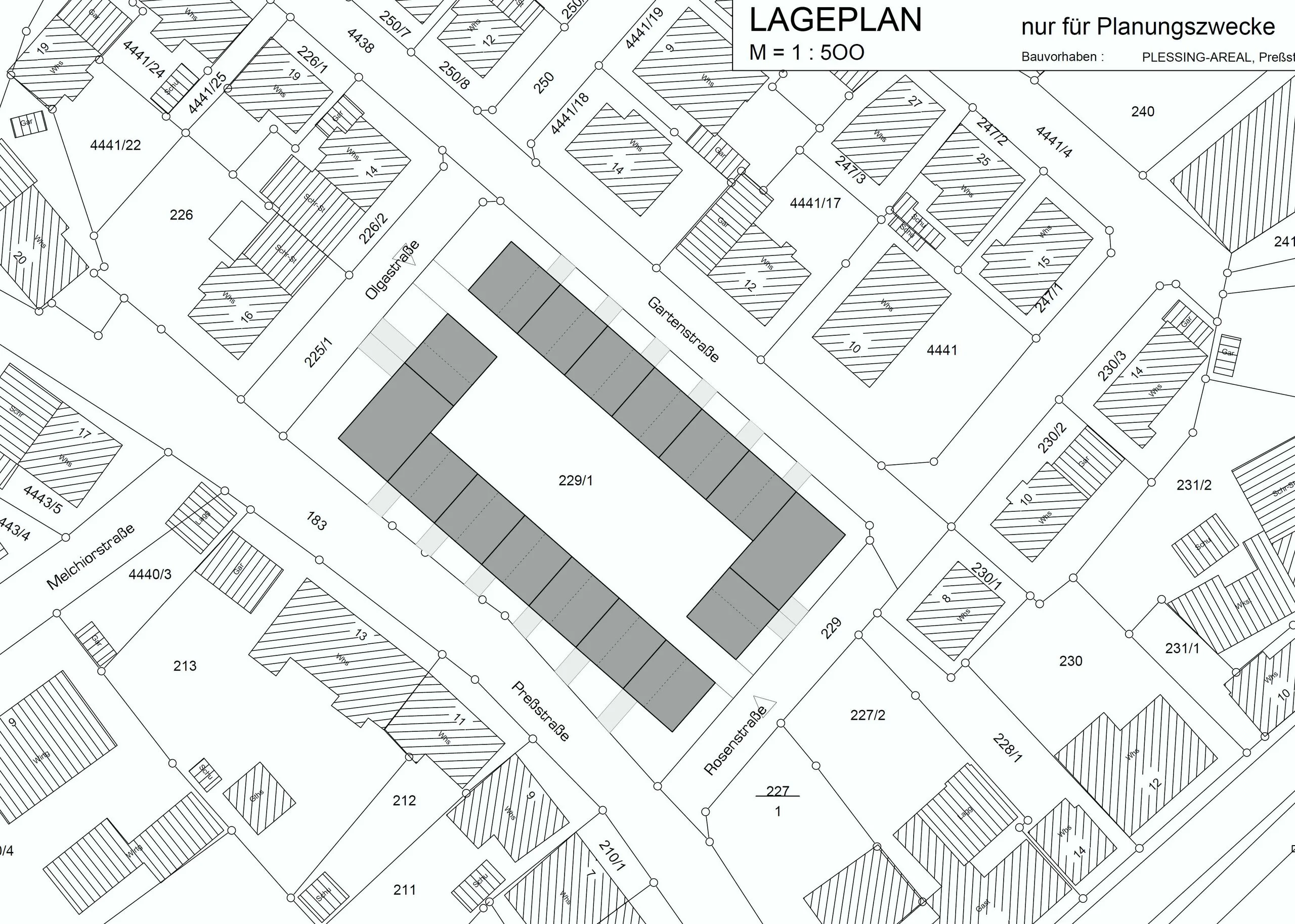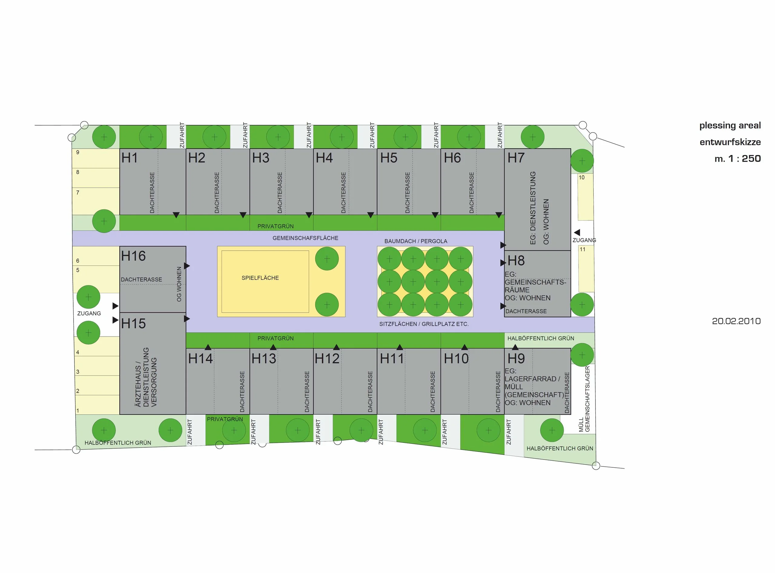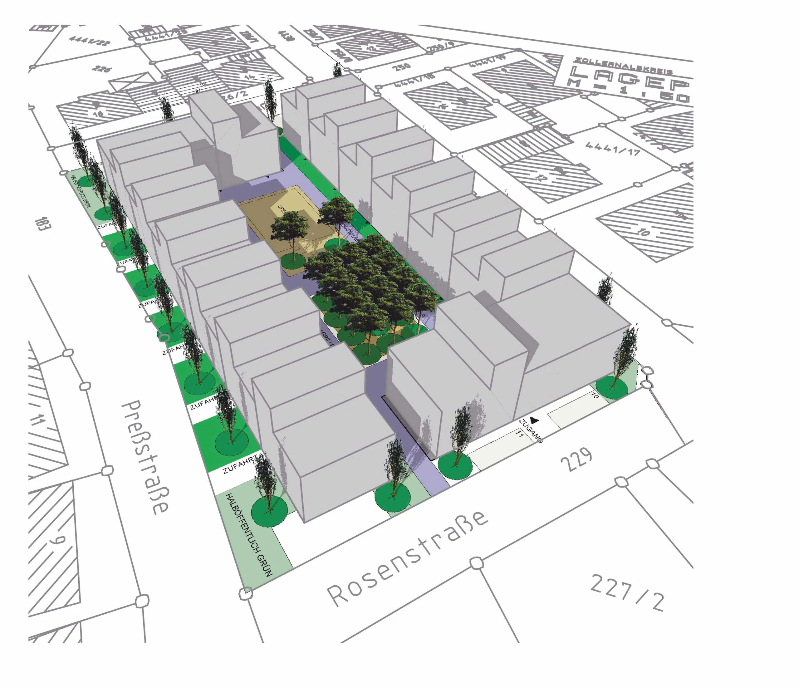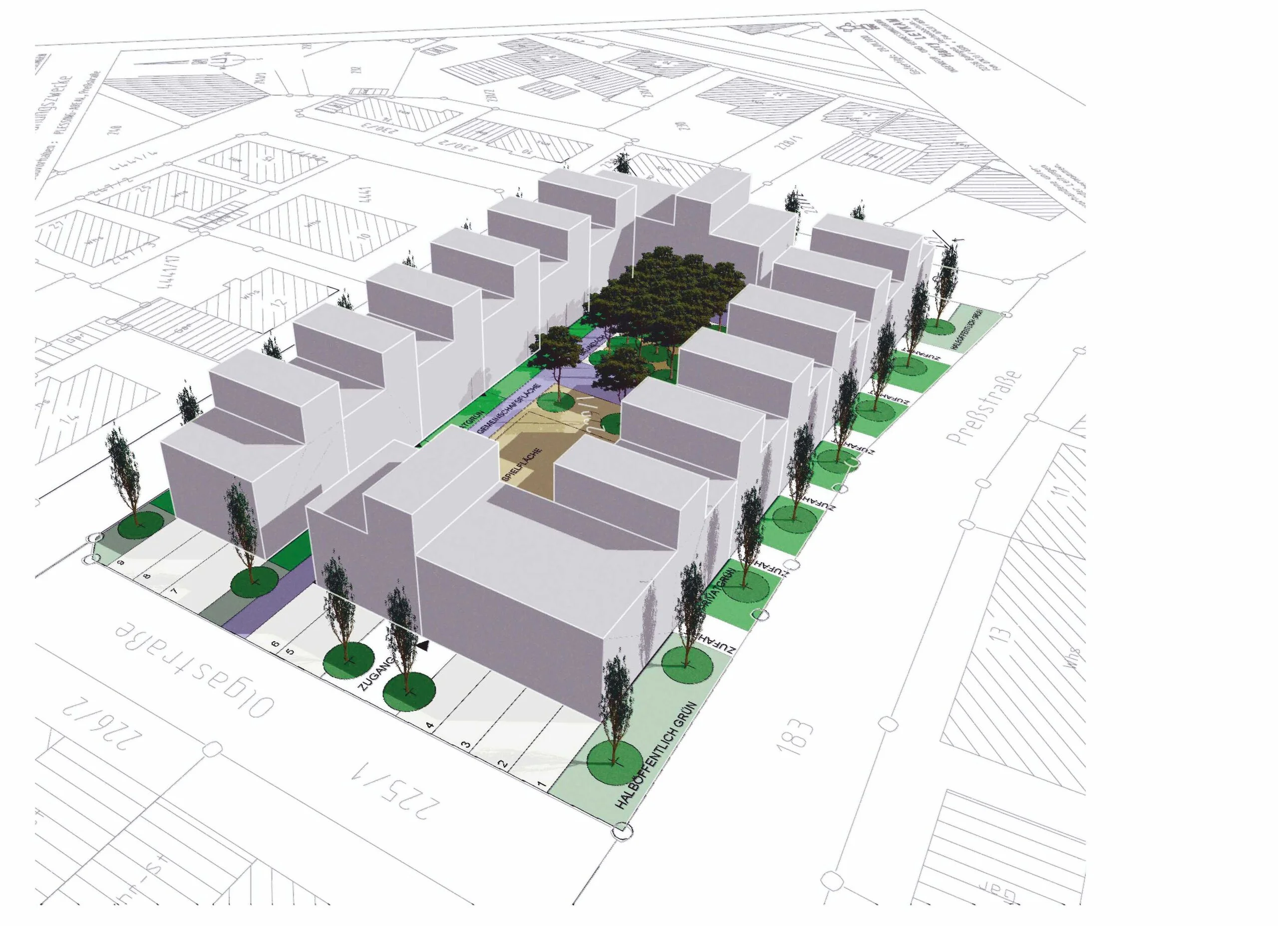 Planungskonzept einer offenen Blockrandbebauung bestehend aus 14 Maisonettewohnhäusern mit Dachgarten, zwei Häusern für Dienstleistung, Ärztliche Versorgung Grundversorgung und Wohnen.