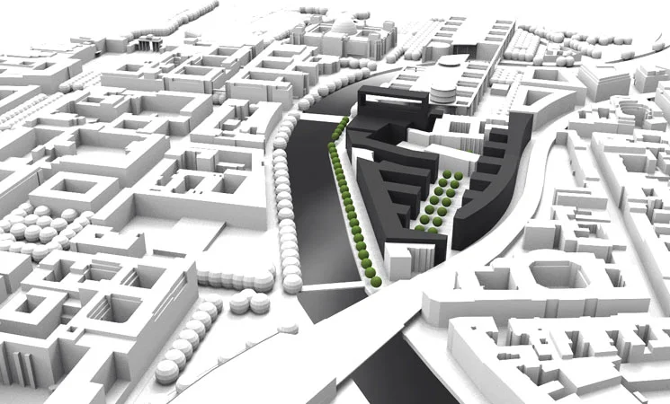 BEWAG-Hallen werden durch Schaffung eines Platzes und die Öffnung des Blockes nach Süden zugänglich, in ihrer historischen Bedeutung aufgewertet und ins Konzept integriert.