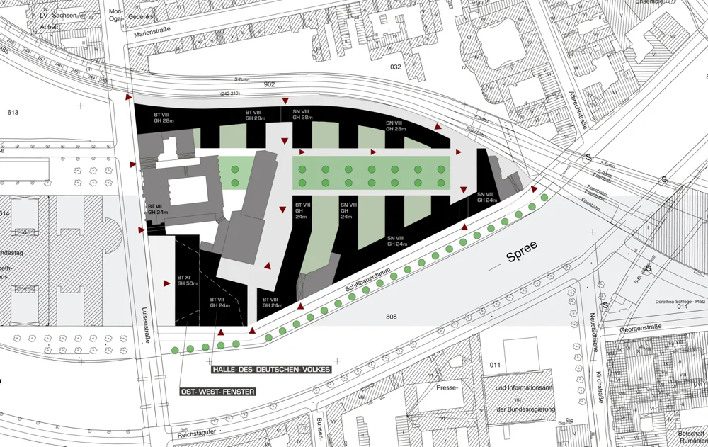 Zwischen Marie-Elisabeth-Lüders-Haus und dem "Ost-West-Fenster" wird eine urbane, öffentliche Platzsituation geschaffen.Das "Ost-West-Fenster" ist öffentlich zugänglich und ermöglicht Ausblick entlang des Band des Bundes.