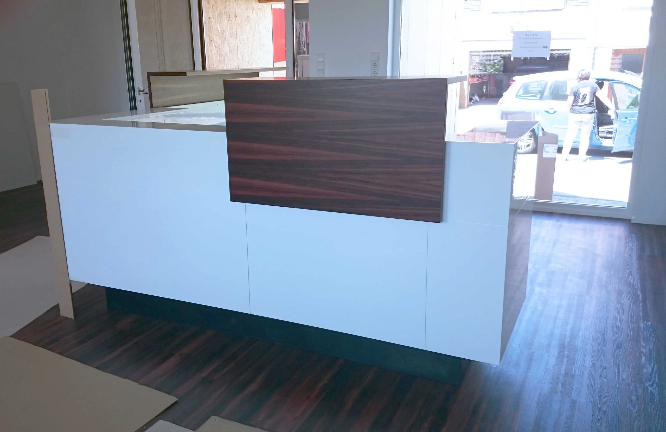 Empfangs- und Multifunktionstheke beim Aufbau.